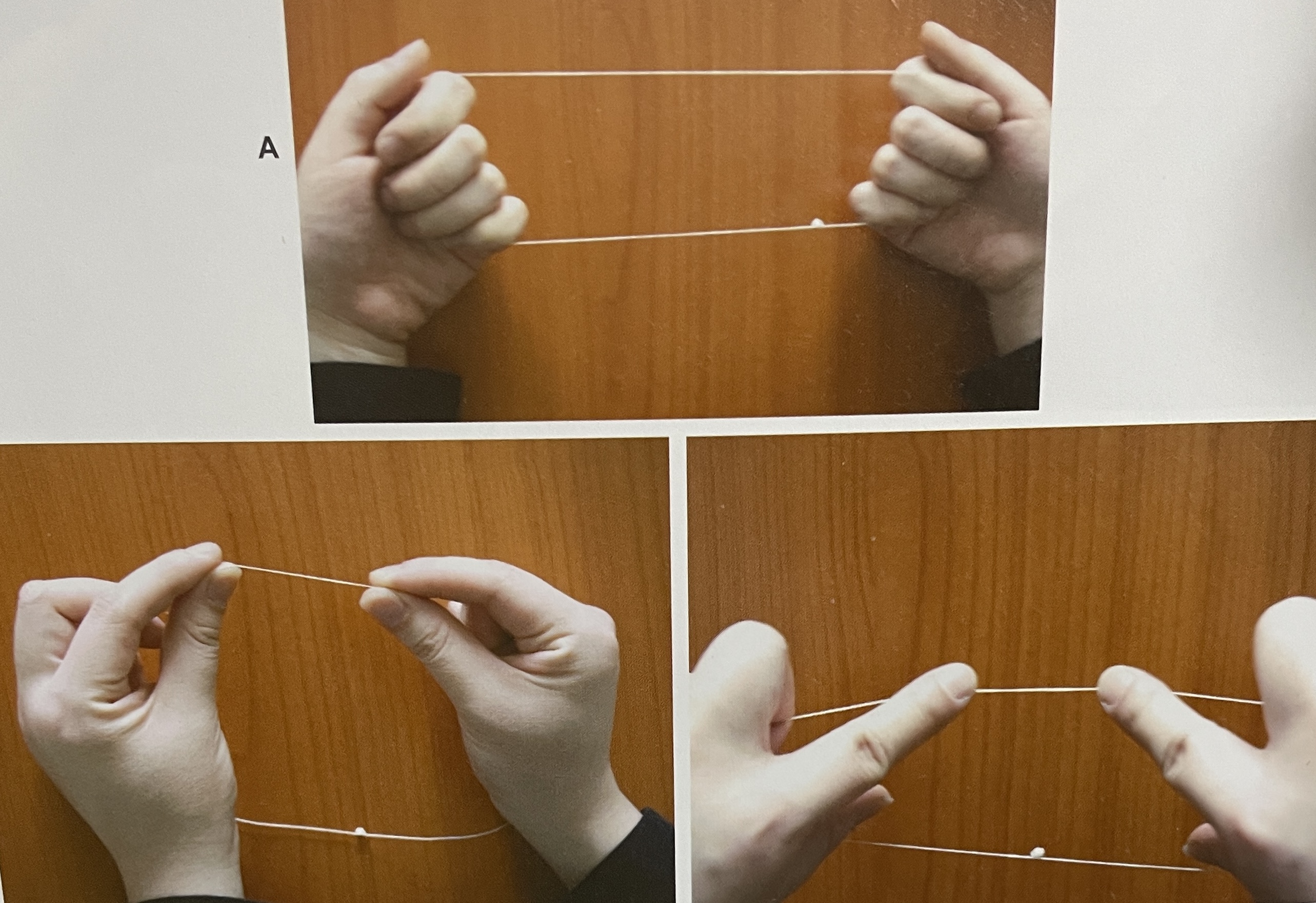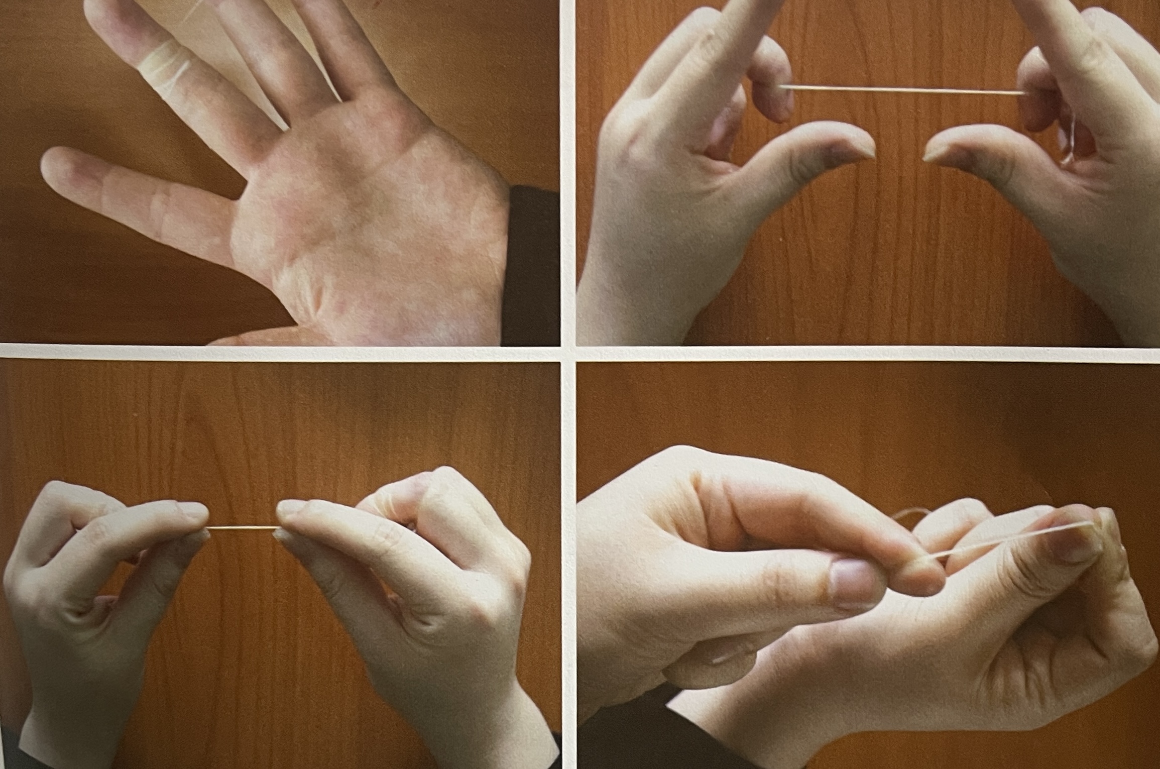 양손에서 엄지를 제외한 나머지 네 손가락을 모아 원 안에 넣고 실을 잡는다.